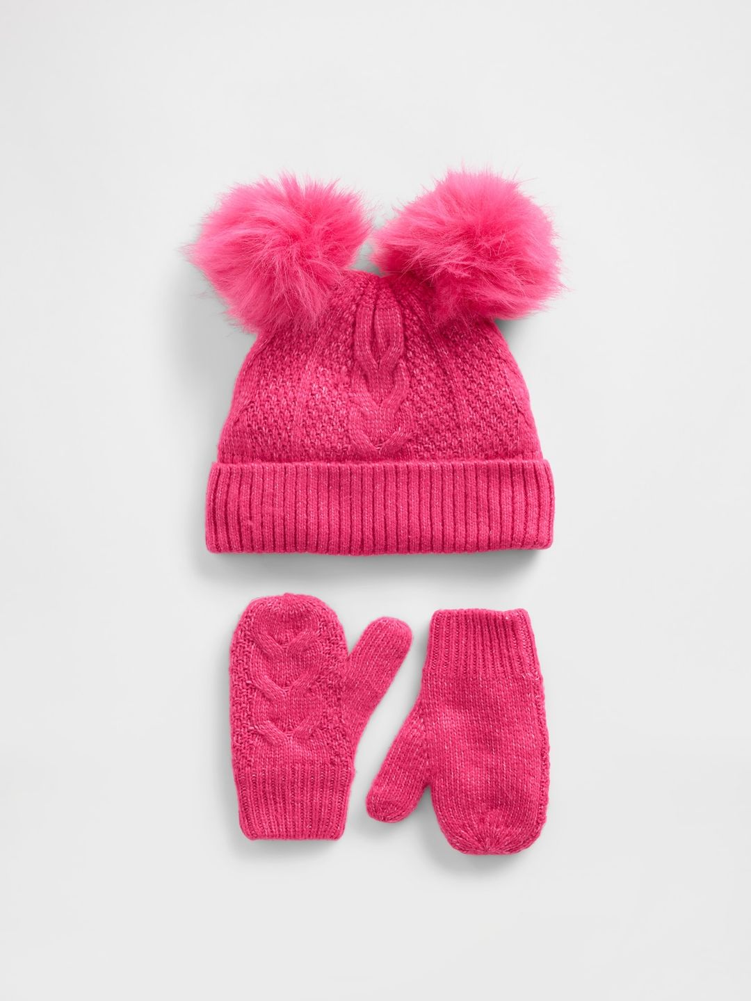 - Čepice má ohrnutý lem a na vrchu zdobné bambulky z umělé kožešiny, rukavičky jsou zakončené žebrovanými lemy pro lepší padnutí.