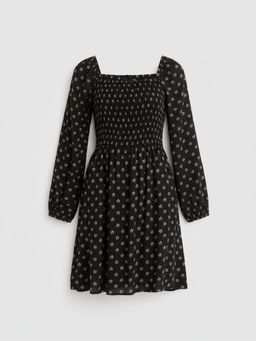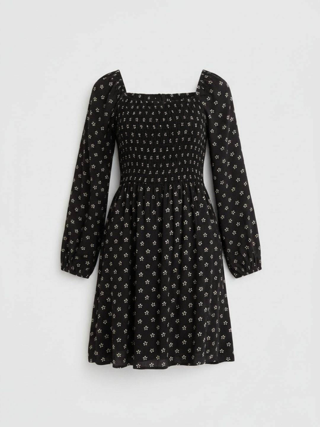 - Šaty mají čtvercový výstřih a dlouhé rukávy, což jim dodává jemný, elegantní vzhled.