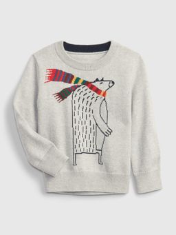 - Dětský pletený svetr s obrázkem medvídka s barevnou šálou.