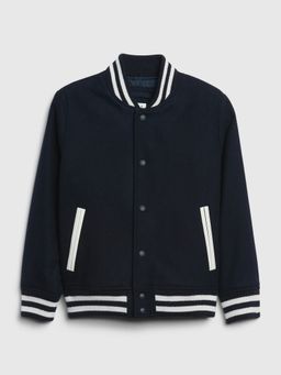 Dětská bomber bunda Gap s kapucí. Vyrobena ze 60% recyklované vlny. Dlouhý rukáv, postranní kapsy, lem a rukávy s pruhy. Odstranitelná kapuce.