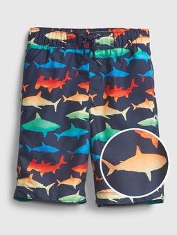 - Tmavě modré plavky s různě barevnými obrázky žraloků.